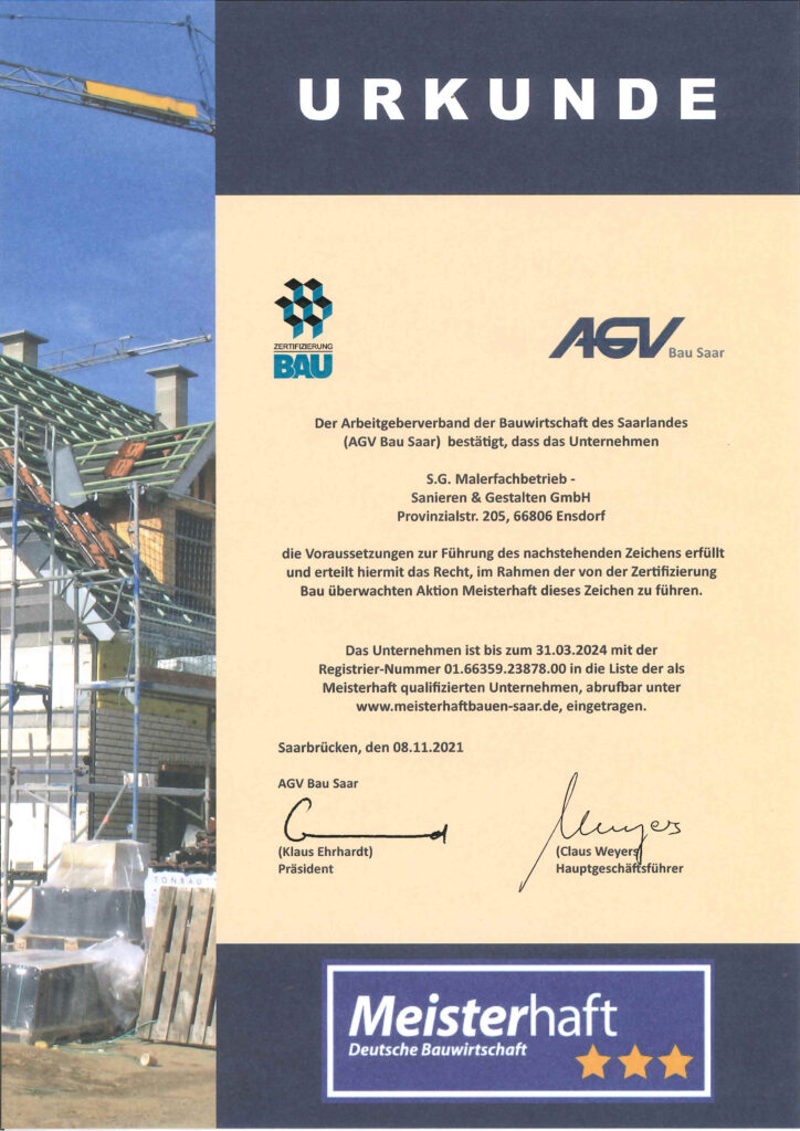 Der SG - Malerfachbetrieb ist ein Meisterbetrieb mit spezialisiertem Fachpersonal. Selbstverständlich sind wir vom SG - Malerfachbetrieb in allen Bereichen immer auf dem neuesten Stand. Deshalb nehmen unsere Mitarbeiter kontinuierlich an Weiterbildungen und Qualifizierungen teil und bauen Ihr fachliches Know-how für Sie ständig weiter aus.