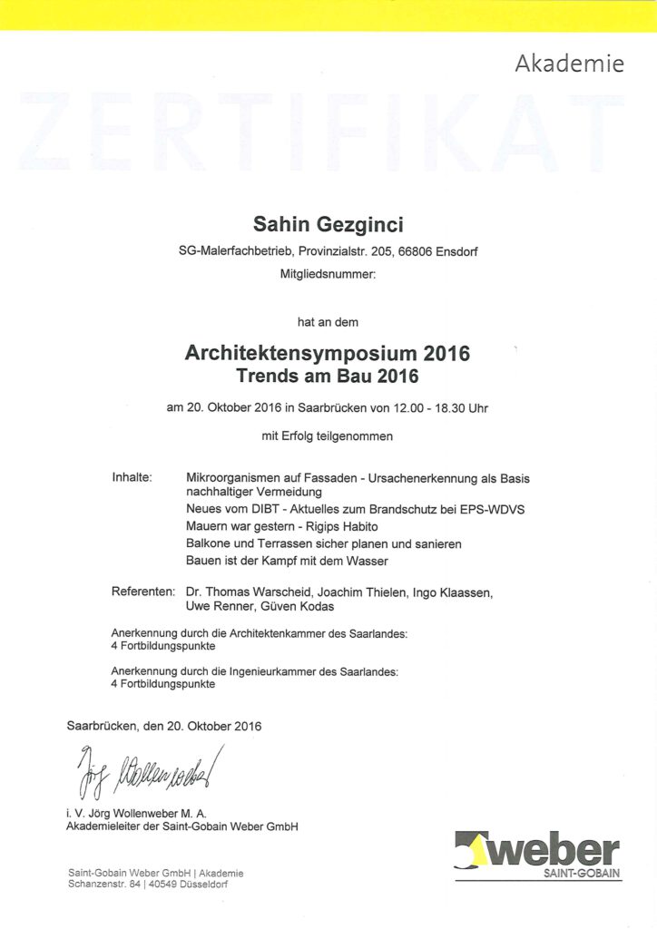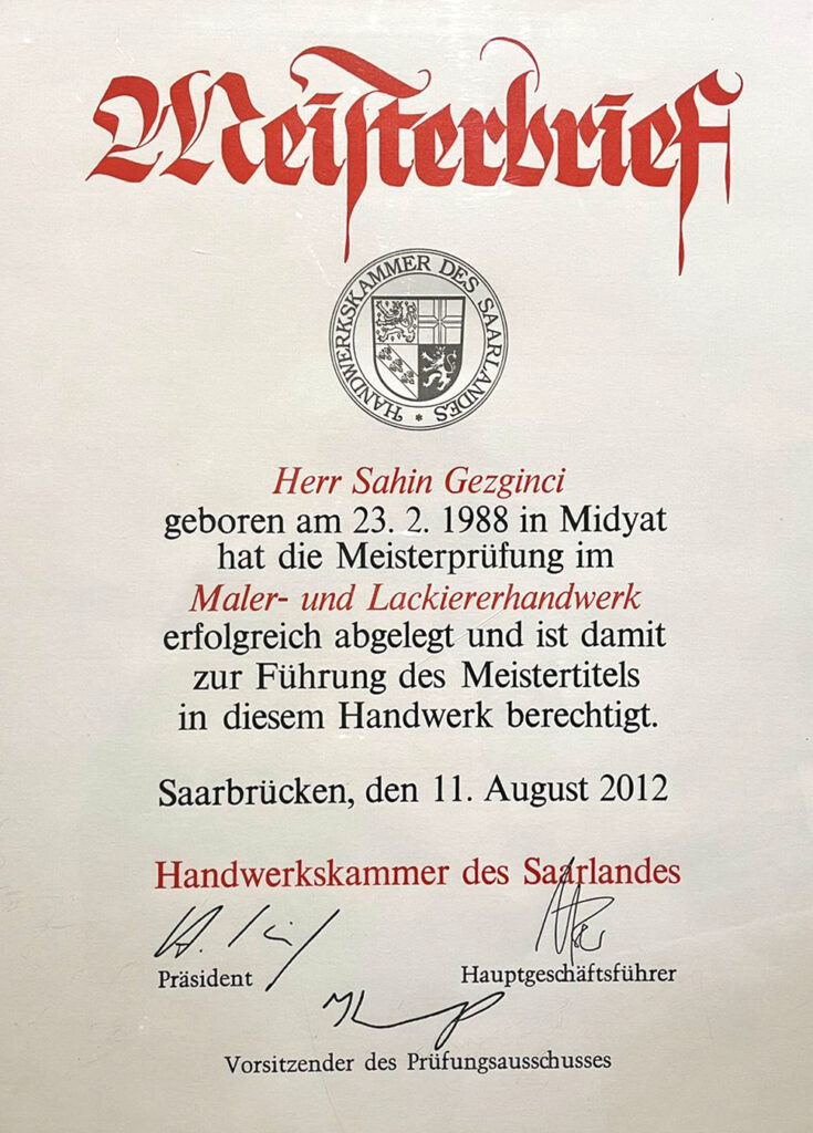 Als Innungsmitglied verpflichtet sich der SG-Malerfachbetrieb, sich an geltendem Tarifvertrag zu orientieren und aktiv an der Gestaltung für die relevanten Themen des Malerhandwerks teilzunehmen. Sahin Gezginci ist aktives Mitglied des Gesellenprüfungsausschusses. Er kontrolliert und bewertet zusammen mit anderen Prüfern die Abschlussarbeiten der angehenden Gesellen.
